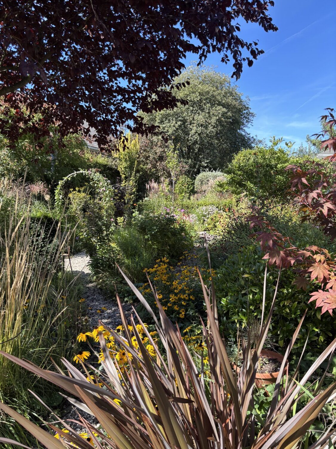 Ruime stadstuin met royale beplanting. Veel bloeiende planten vanaf het voorjaar tot ver in de herfst. Bloeiende planten worden afgewisseld met siergrassen, struiken, bomen en hagen. De tuin wordt doorkruist met paden, er is een vijver, diverse zitjes, een kleine tuinkas en een overkapping. Ook compostbakken en rommelhoekjes voor de dieren en insecten. In de tuinkas overwinteren de mediterrane potplanten, in het voorjaar worden daar eenjarigen gezaaid en in de zomer groeien er tomaten. Er is altijd veel te zien!