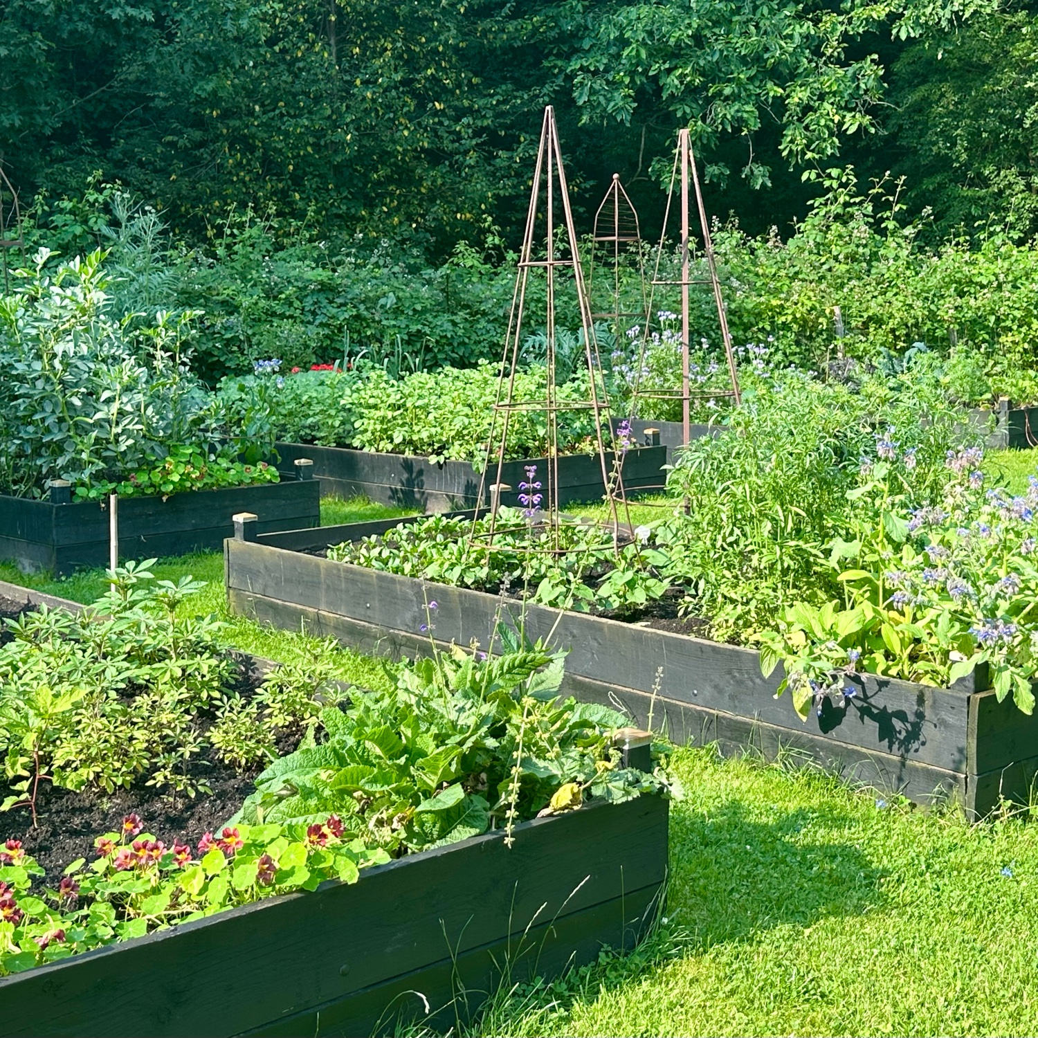 De tuin is omgeven door hoge eikenbomen en heeft verschillende verhoogde eilandborders.Verder is er een boomgaard met oude fruitbomen, een verborgen bostuin, een moestuin met verhoogde bakken en een tuinkas.