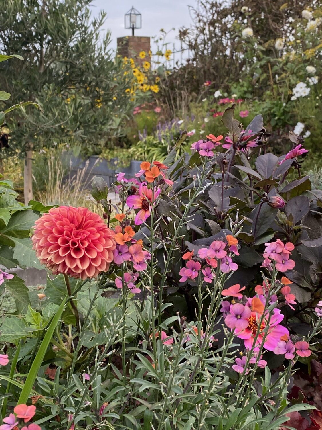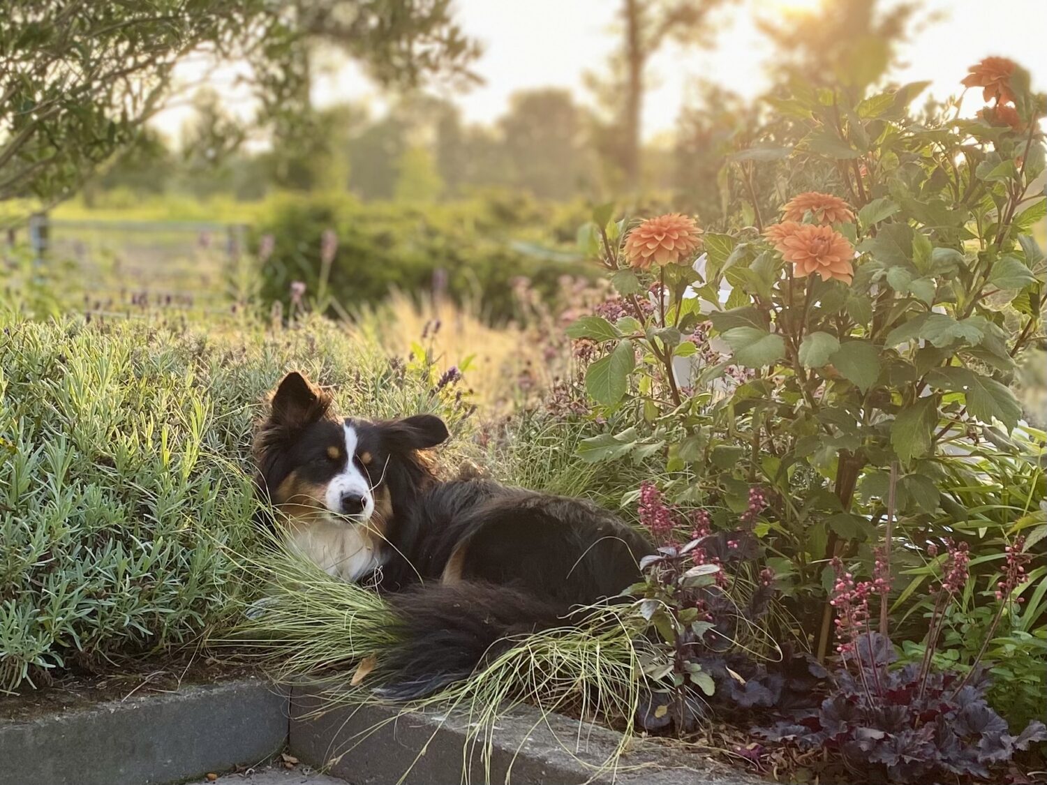 De tuin is onderdeel van de prachtige omringende natuur en heeft daardoor een natuurlijke, ietwat wilde uitstraling. Er zijn veel siergrassen en allerlei soorten kruiden zoals rozemarijn, salie en tijm, maar ook lavendel, verbena, rozen, sieruitjes, pioenrozen, dahlia’s, wijnruit, venkel, lupines… in totaal zo’n 120 soorten planten en bloemen. Het is een oase van rust die je gewoon uitnodigt om even te stoppen.