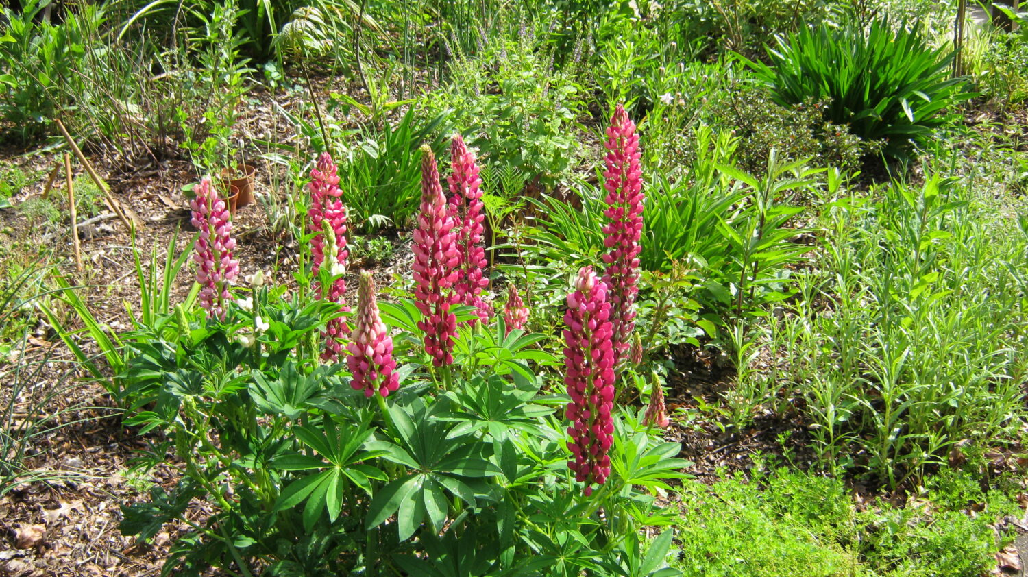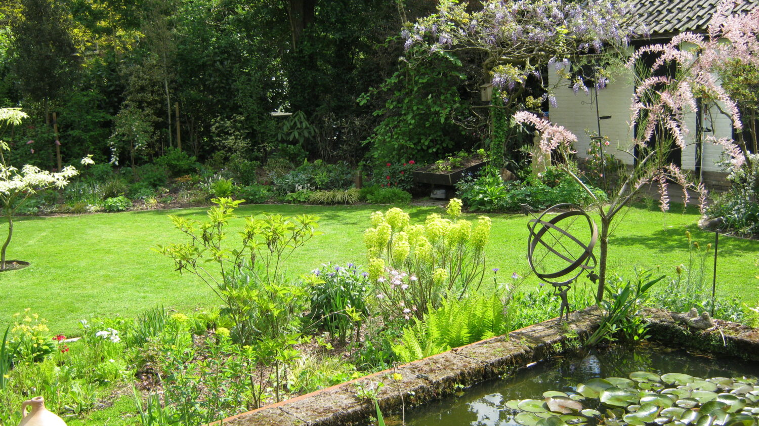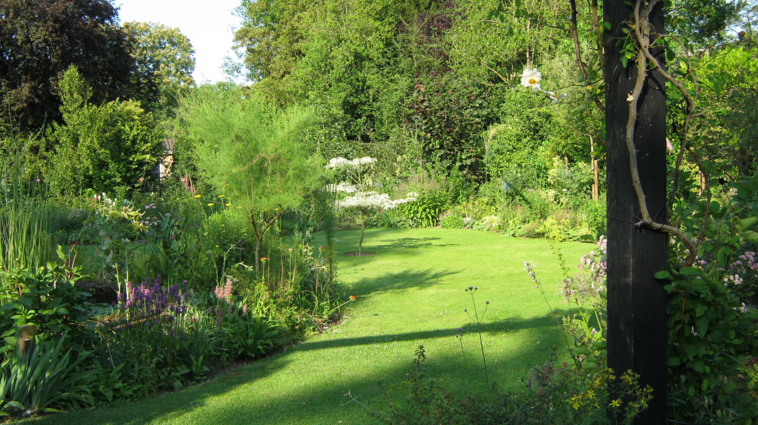 Samen met de ‘onbekende’ planten ontvouwt zich een totaalbeeld dat een ernstige verzameldrift van Ton bloot legt. Daar komt dan ook nog bij dat hij er nooit over uitgepraat raakt, een eigenschap waar de bezoeker zijn voordeel mee kan doen. En er valt veel te vertellen. Over de combinatie vijver/moerasje, over de Tetrapanax, de diverse Magnolia’s, Edgeworthia, Acca sellowiana ‘Coolidgei’, de pas in augustus bloeiende Rhododendron auriculatum, de oranje bloeiende Mahonia ‘Cabaret’, Callistemon ‘Woodlanders Red’, enz. Door in overleg met de buurvrouw ook in haar tuin enkele heesters en bomen te planten is de eigen tuin optisch groter geworden.