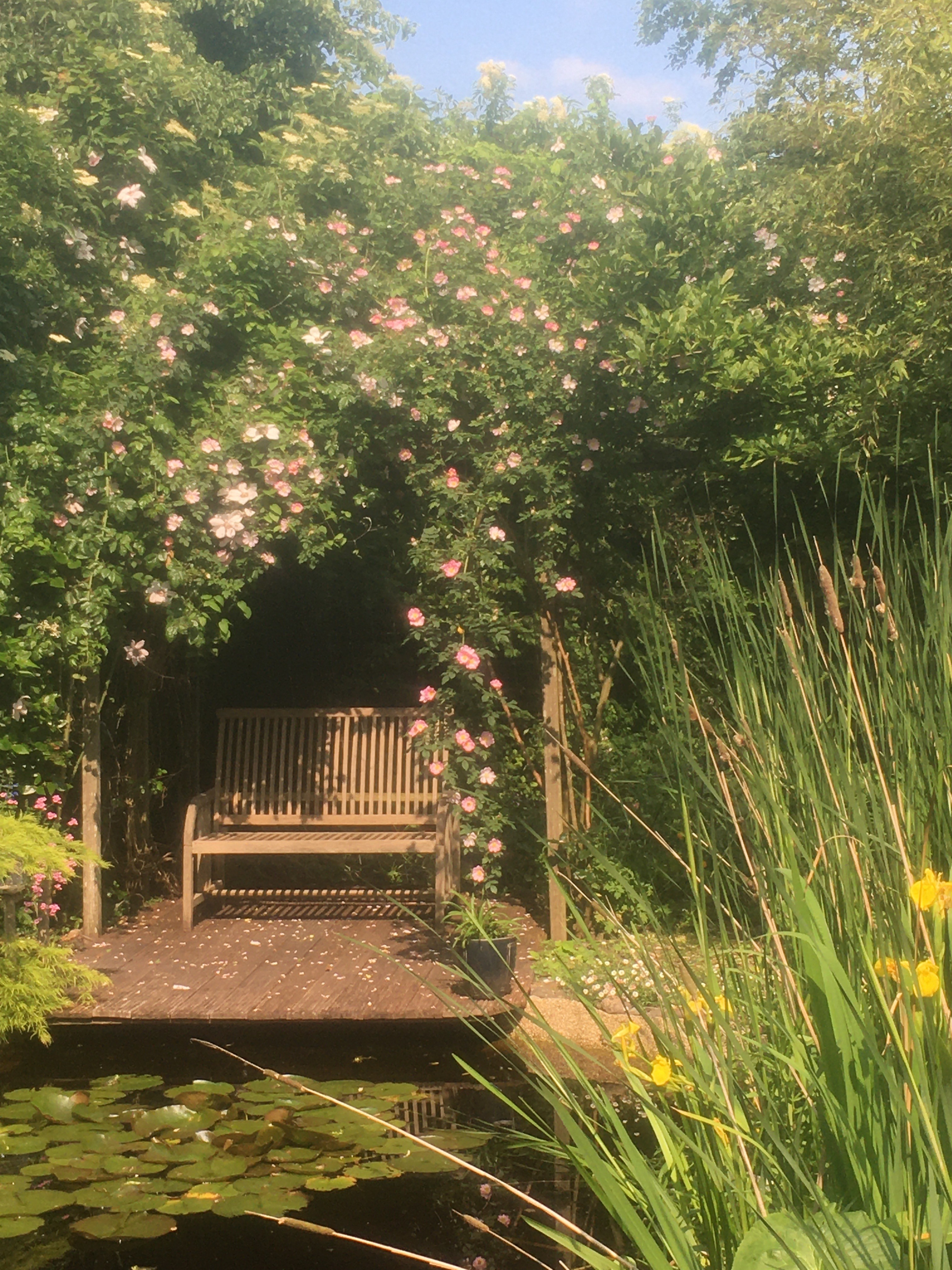Achter het huis een door een beukenhaag omsloten binnentuin met borders in een strak patroon rond een royale vijver. Daar buiten een grote weide waarin steeds meer bloemen worden geïntroduceerd. Hoog-stamfruitbomen en nieuwe aanplant laagstammen. Twee grote hortensiaborders smeden buiten- en binnentuin aaneen.