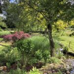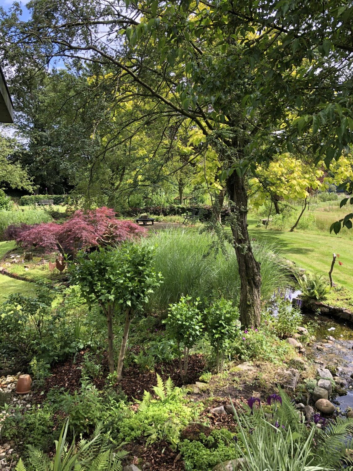 In totaal is deze tuin 1,5 hectare groot, waarvan de helft bestaat uit weiland met daarin een kikkerpoel. De tuin zelf loopt over naar een een boomgaard gevuld met allerlei bloemenborders. De fruitbomen geven in het voorjaar prachtige bloesems. In het najaar schitteren de pluimhortensias en de gele Heleniums.