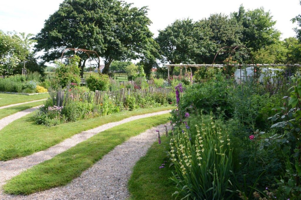 Verrassend is de mini-prairie en de Droge Dijk met grassen, vaste planten en strandpalen. De grond is hier bedekt met schelpen en zo geven ze een Zeeuws vakantiegevoel. De groentetuin met lange rozenpergola is omzoomd met een schapenhek en kleurrijk door een mix van eenjarige en plukbloemen. Een rozenborder langs de zijkant geeft behalve kleur en geur een mooi uitzicht over het Zeeuwse landschap. Het karrespoor achter in de tuin maakt een mooie wandeling door de tuin mogelijk en in de Vintage rozentuin is het een kleurrijke mix van Engelse rozen, vaste planten en bloembollen. Mocht u extra willen genieten dan kunt u op een van de vele bankjes die in de tuin staan alles rustig in u opnemen.