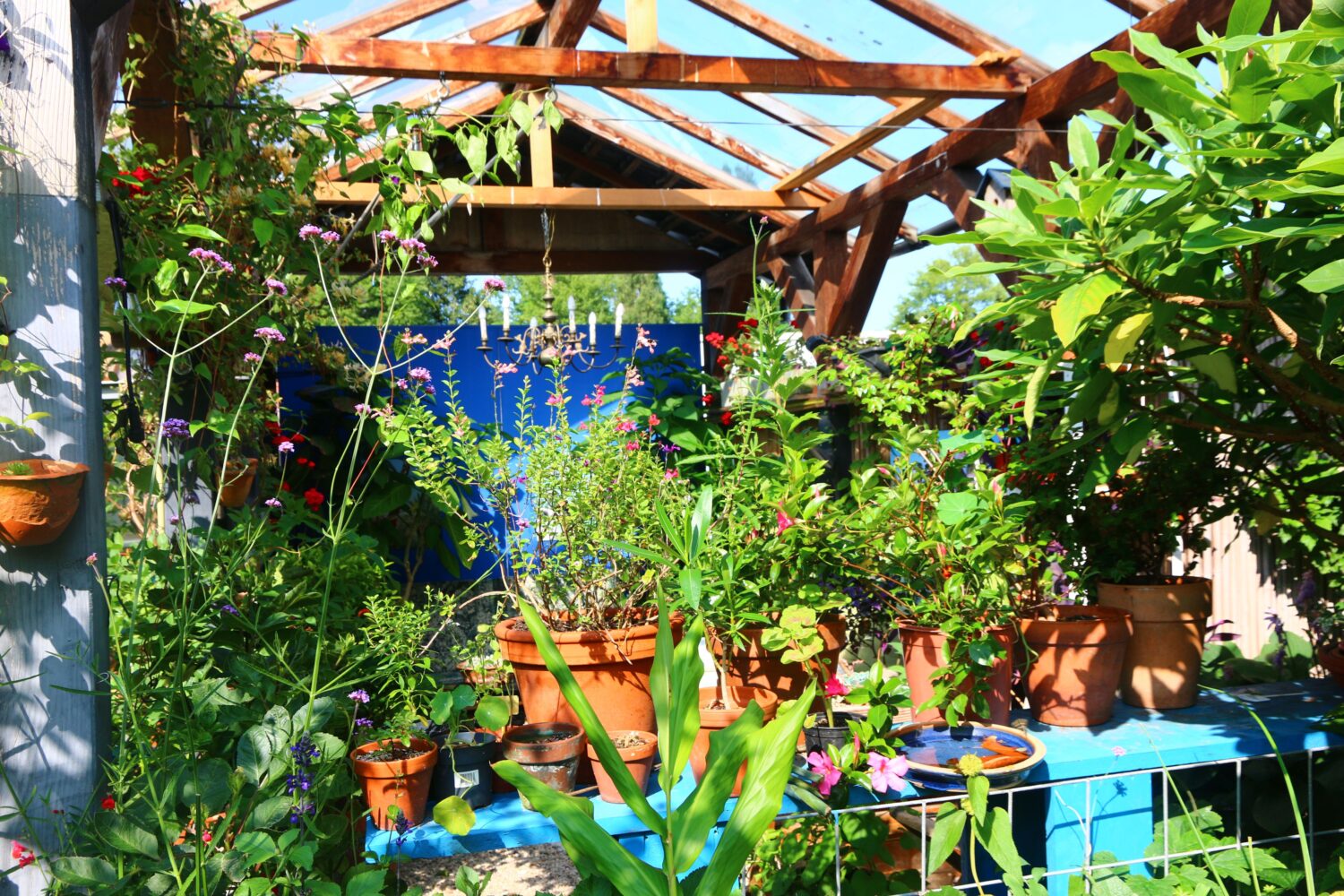 Groenten, fruit en sierplanten staan door elkaar in de verhoogde borders. De kiwi en de appelboom zijn onze oudste en beeldbepalende planten.